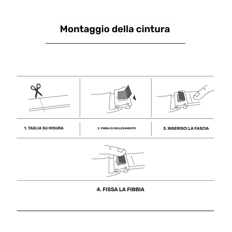 Taglia: pensata per essere rifilata a misura con forbici e reinserimento fibbia.